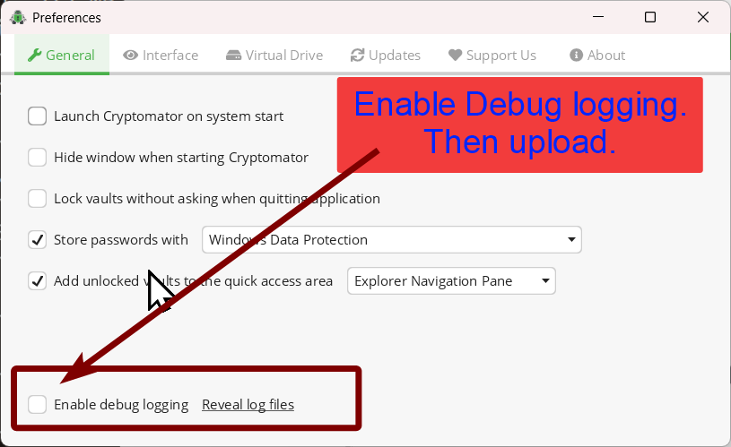 ErrorCode: 3O07:PL32 W 20260302213116.694 Message Ein Fehler ist aufgetreten W 20260302213117.661 CryptoFs Failed to parse cipher text name of: /myVault/d/B2/SOME30CHARS/dirid.c9r W 20260302213118.876 CryptoFs Failed to parse cipher text name of: /myVault/d/RK/SOME30CHARS/dirid.c9r E 20260302213123.498 ExceptionHandler java.lang.NumberFormatException: Expected a long but was 18446744073709551615 at line 5 column 34 path $.metadata.created at com.google.gson.stream.JsonReader.nextLong(JsonReader.java:1111)