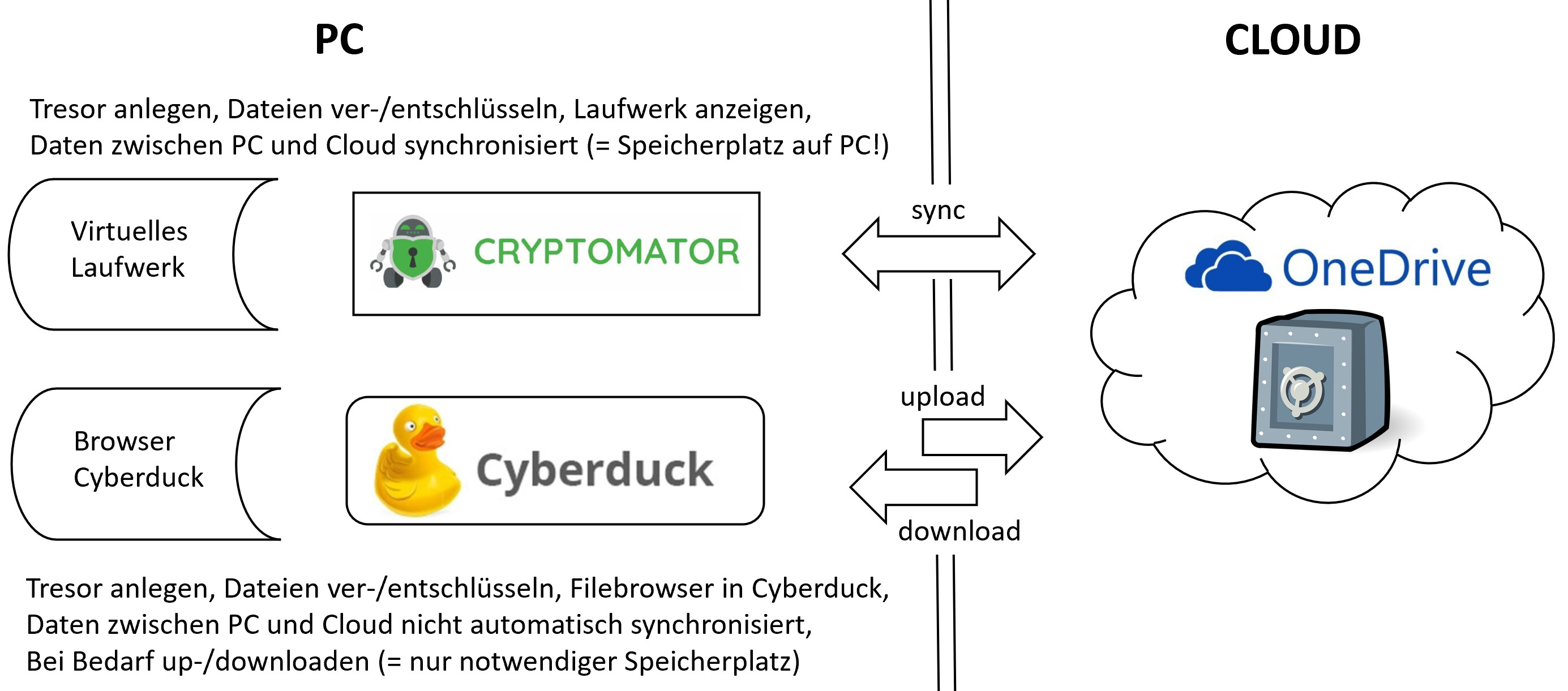 Mit Cyberduck kann man Dateien in einen großen verschlüsselten Tresor in den Cloudspeicher (größer als der Speicherplatz auf dem Rechner) schieben und bei Bedarf die gewünschte Datei wieder auf den Rechner hochladen, also den Tresor (oder die Tresore) eher als erweiterten Speicher nutzen.