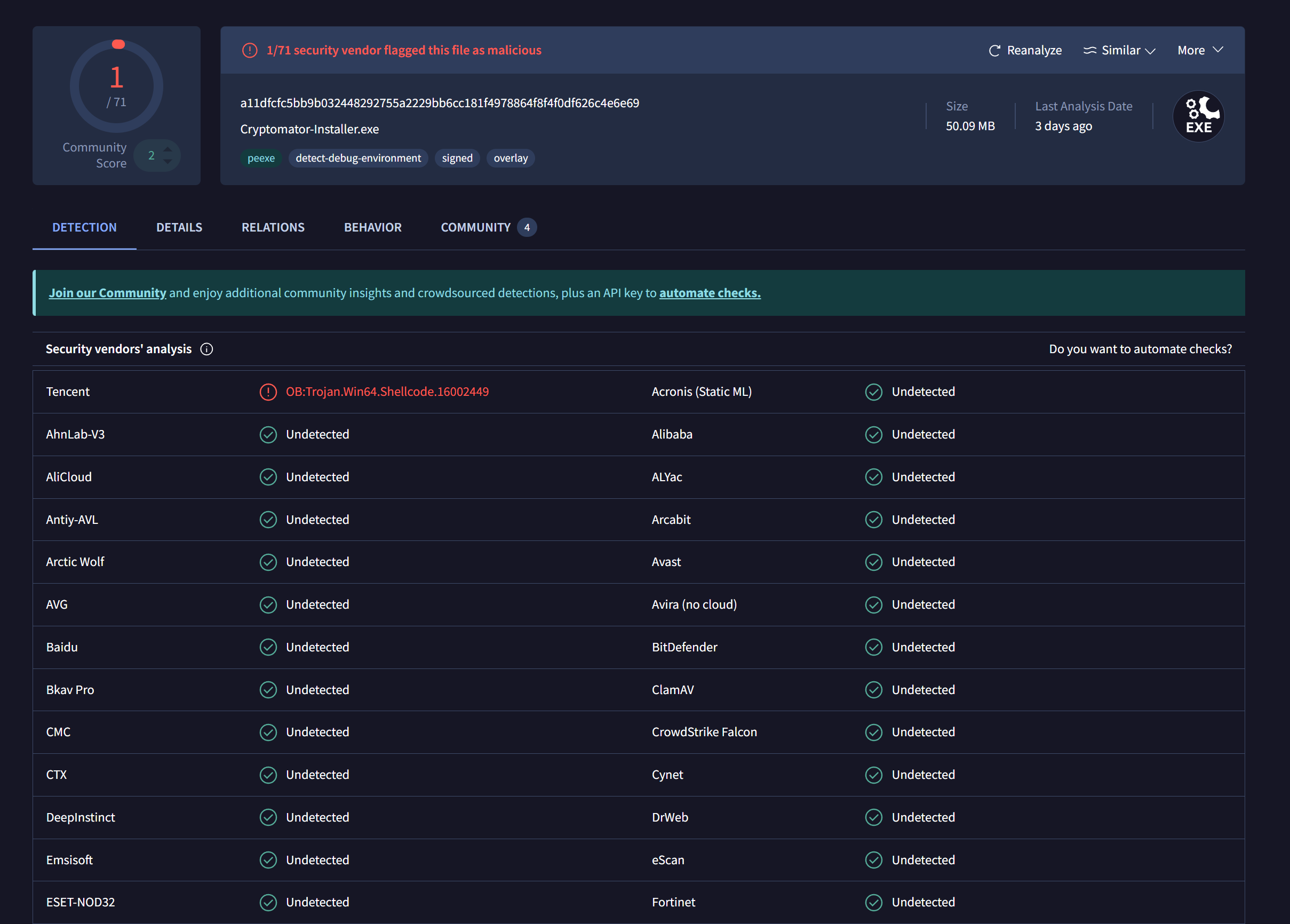 I decided to try Cryptomator again, but wanted to update to the latest version since I have 1.9.1 installed. To be safe I ran the install file I downloaded from the web site of the new version in Virustotal, and I am getting a detection from Tencent for: OB:Trojan.Win64.Shellcode.16002449. I suspect its a false positive, but just wanted to check to be sure.